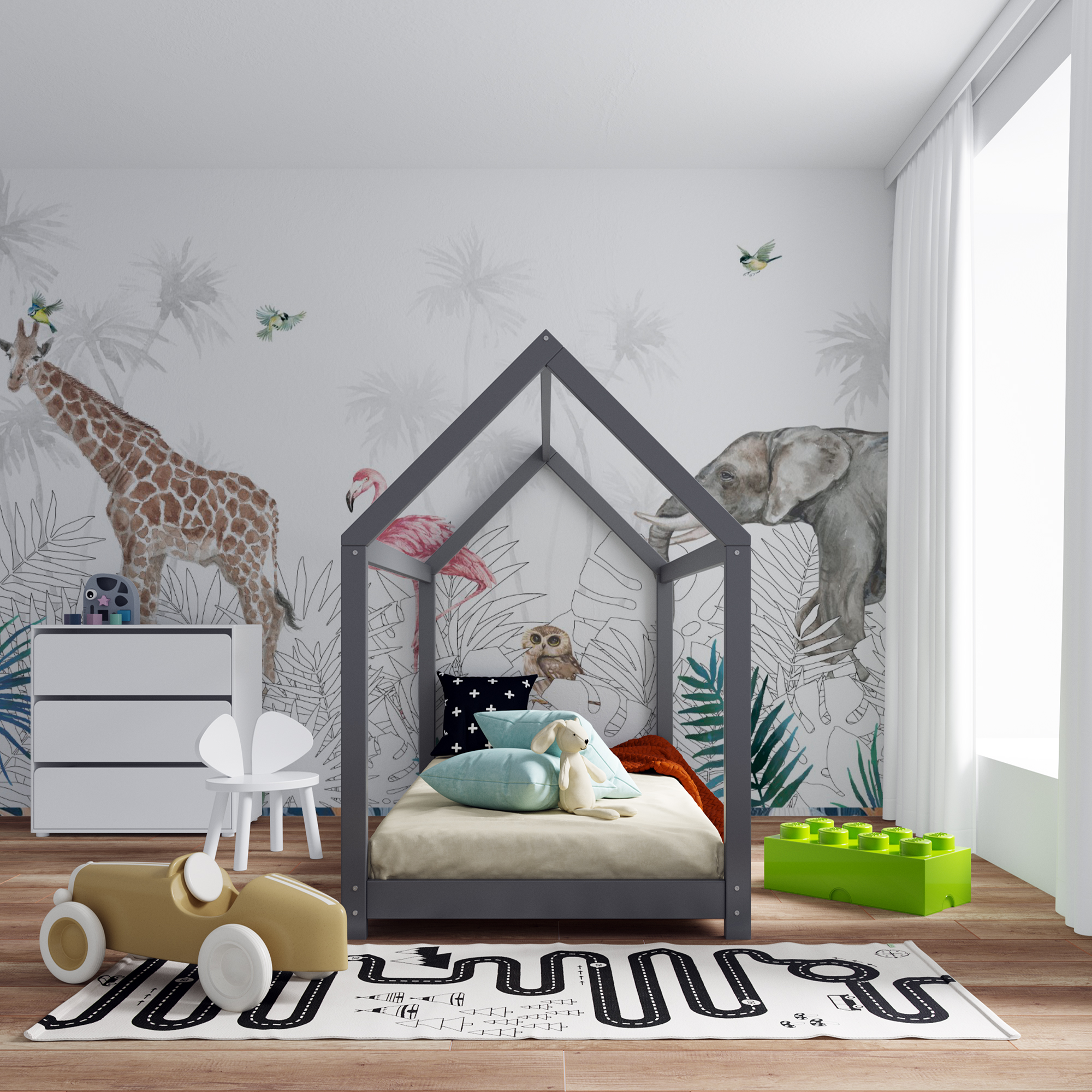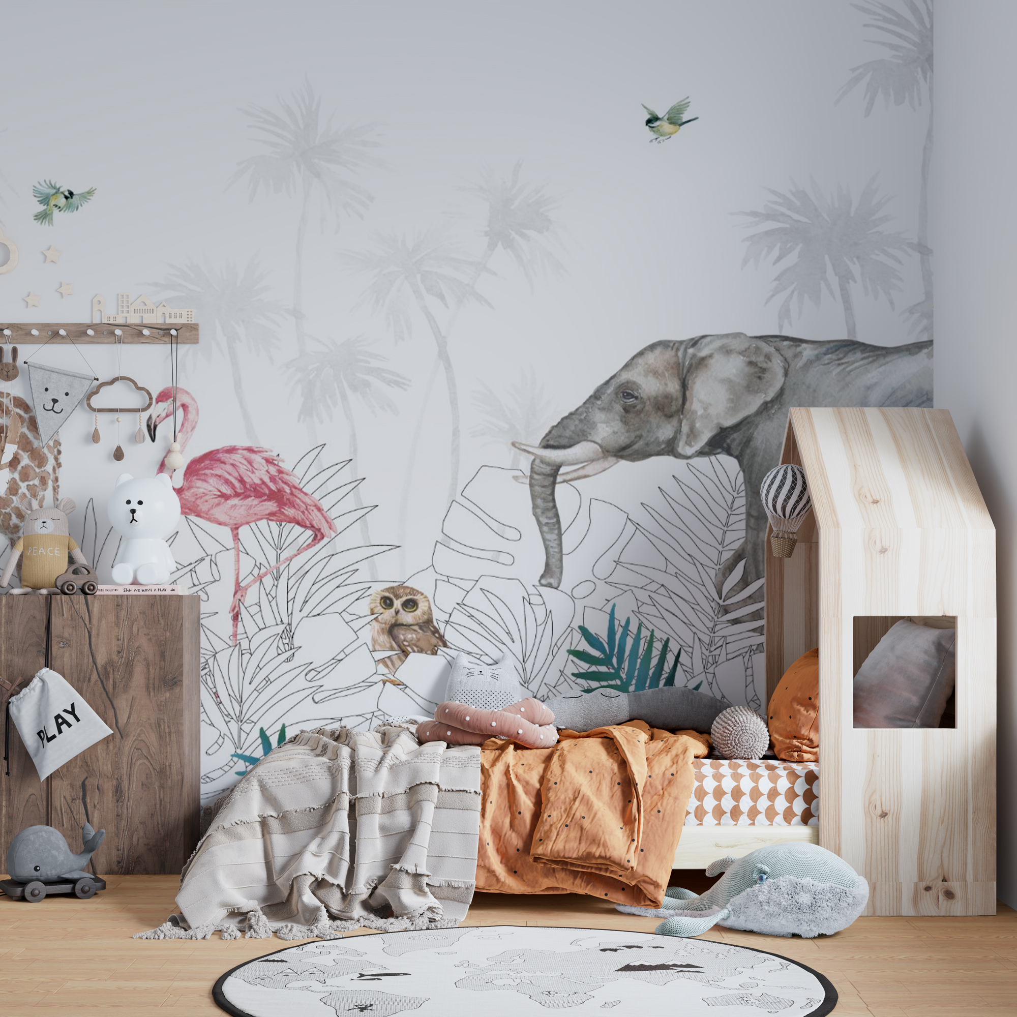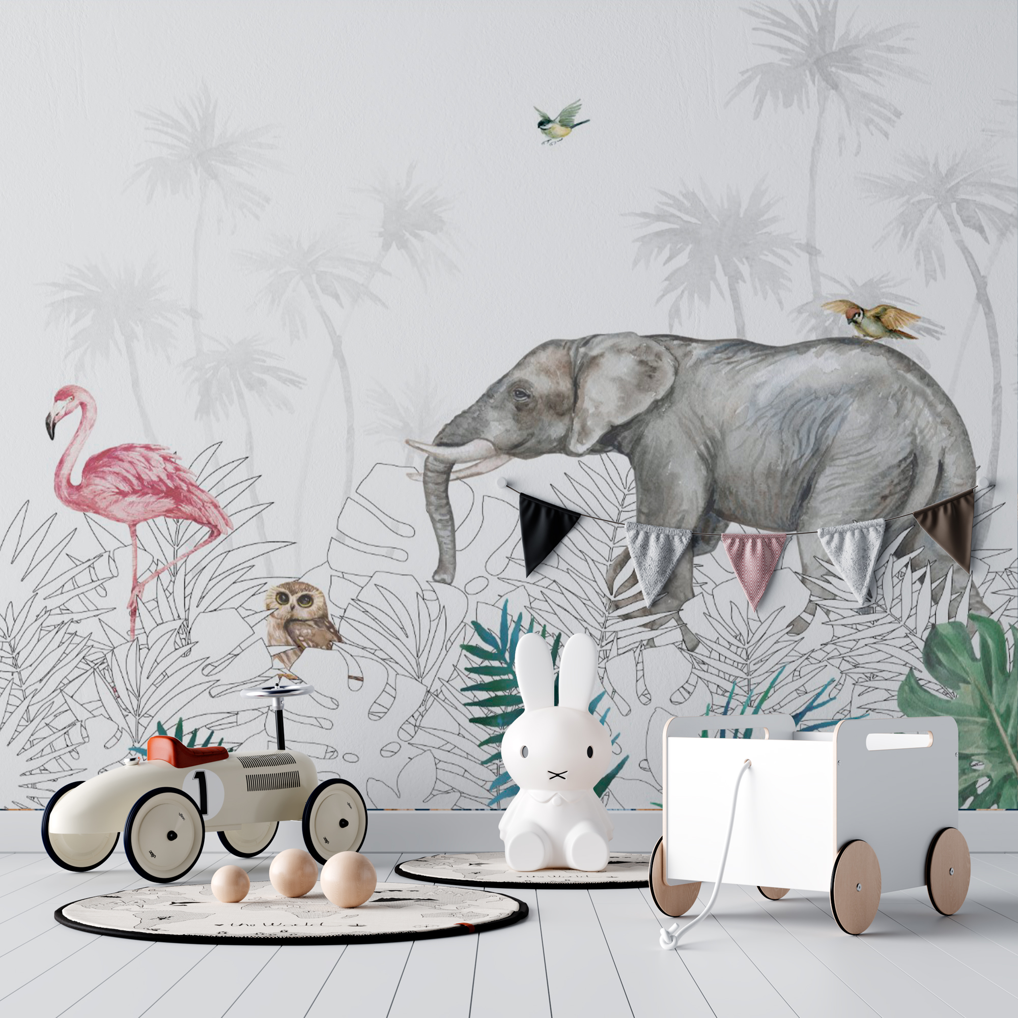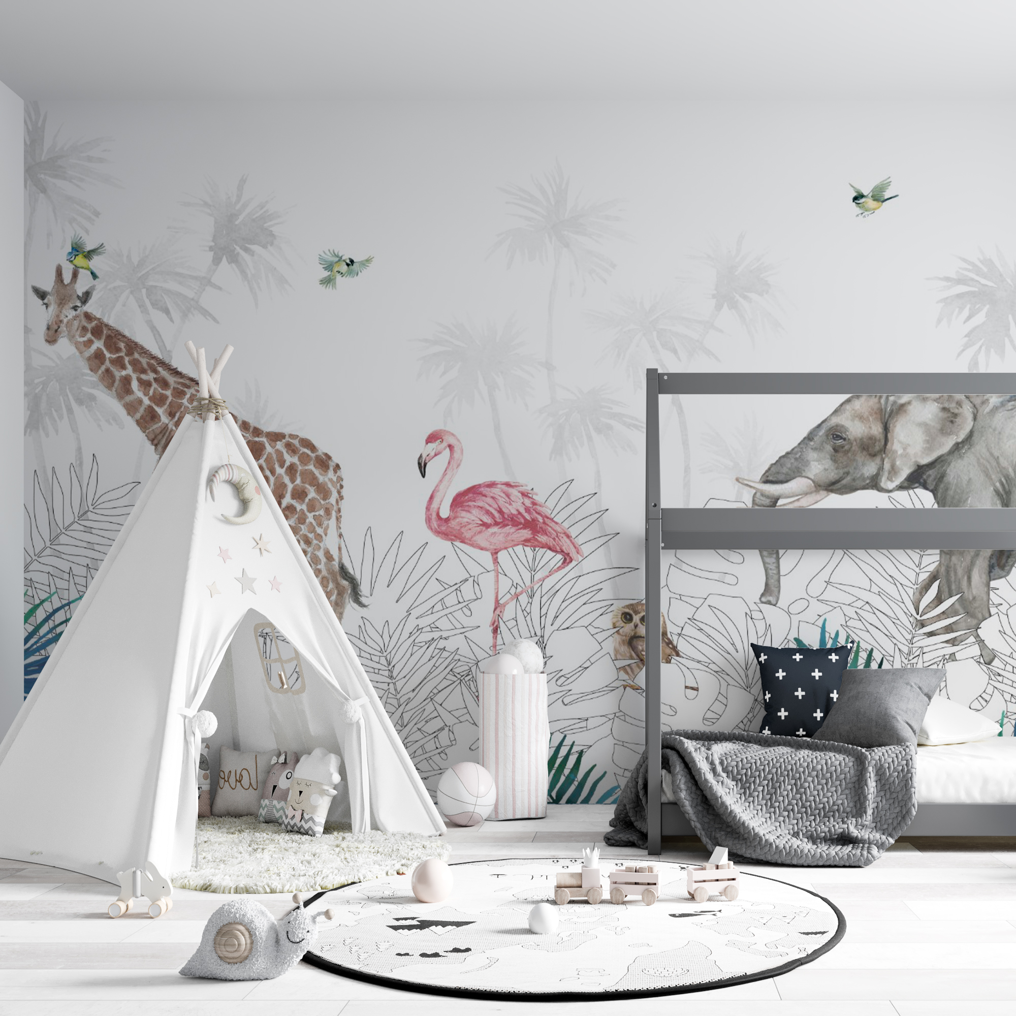 Фотообои "Животные в джунглях" выполнены на немецкой флизелиновой основе с виниловым покрытием. Обои из категории Детские будут служить не только украшением детской комнаты, но и с их помощью малыш сможет изучать мир.