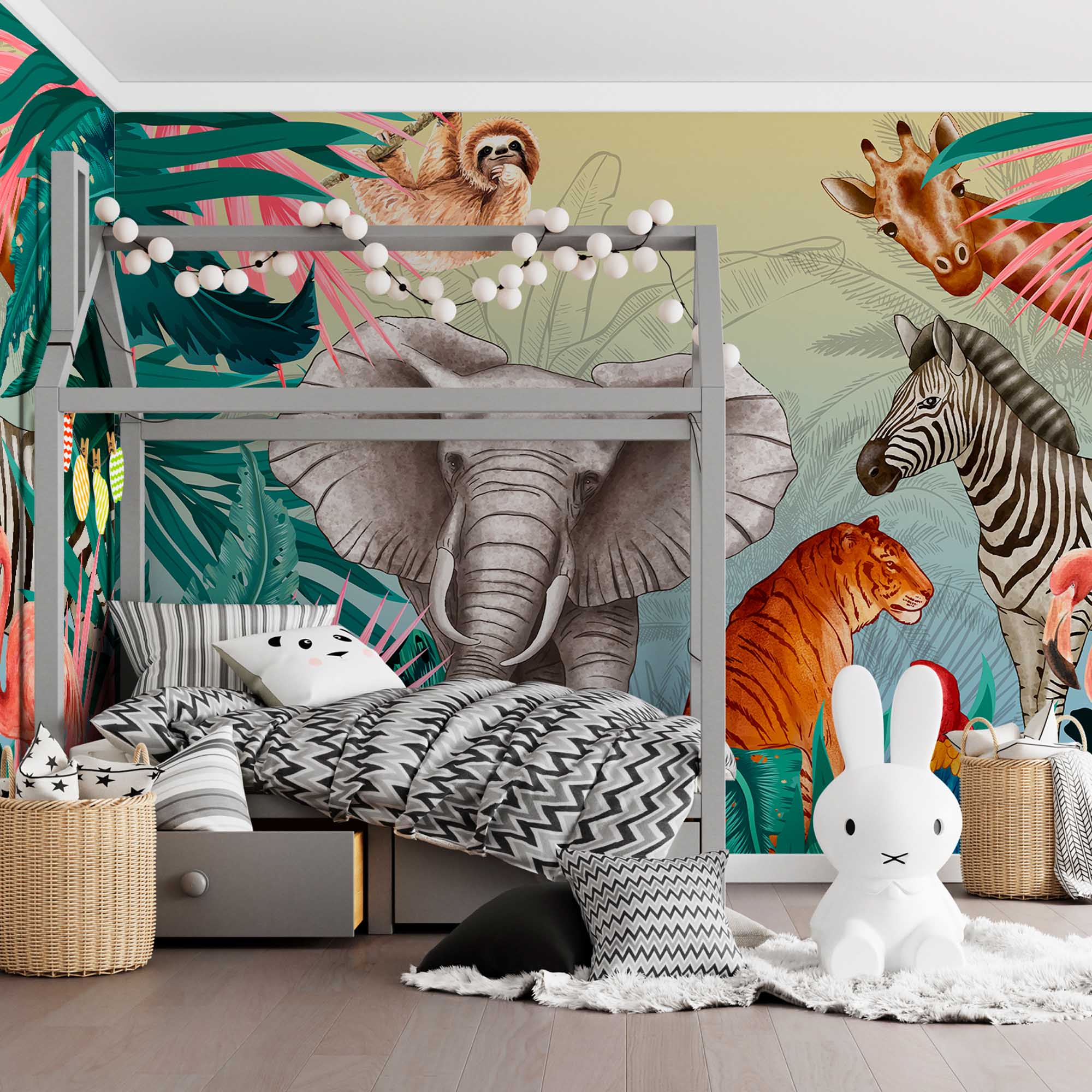 Фотообои "Тропики с животными" выполнены на немецкой флизелиновой основе с виниловым покрытием. Обои из категории Детские будут служить не только украшением детской комнаты, но и с их помощью малыш сможет изучать мир.