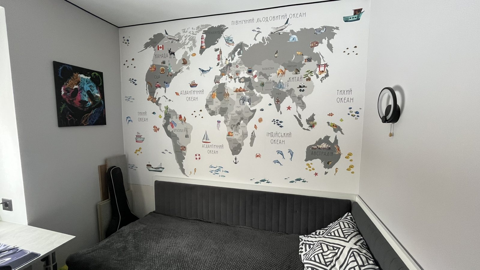 Полотна с изображением животных, автомобилей, городских панорам или мультипликационных героев – отличное решение для декорирования стен детской комнаты.