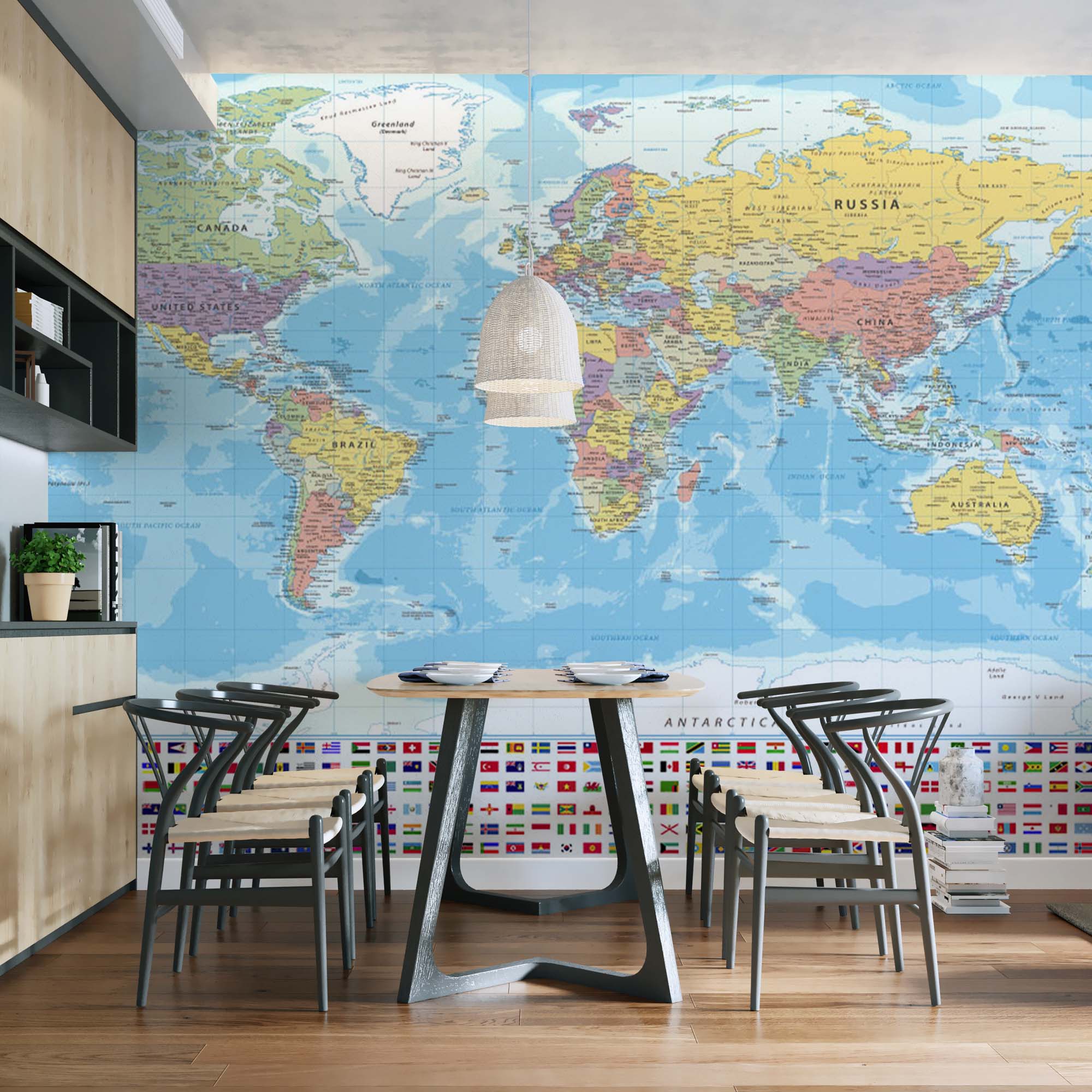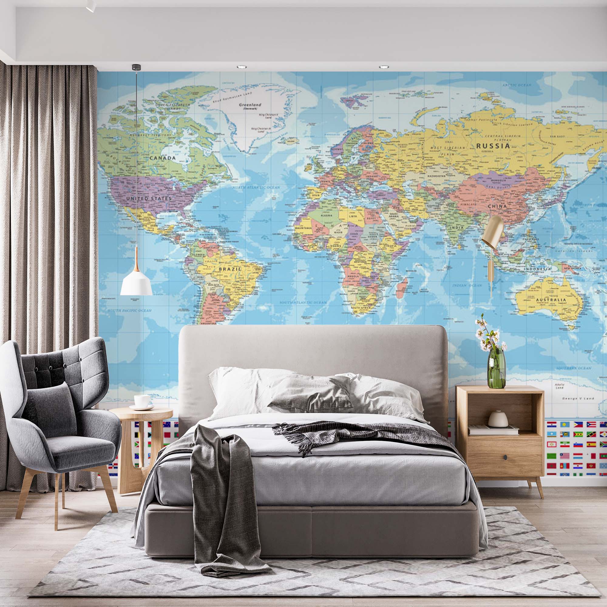 Фотообои "Карта мира" выполнены на немецкой флизелиновой основе с виниловым покрытием. Обои из категории Карты в основном выбирают для детских комнат, но они будут не менее актуальны для офиса или для спальни путишественника.